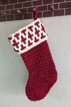 The pattern includes complete written instructions for the full stocking, including the hanging loop. Also included is a mosaic crochet chart to work the mosaic crochet cuff and step-by-step photos to work the short rows that form the heel.